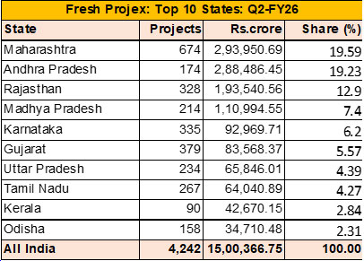Fresh investment announcements in Q3/FY26 (Oct–Dec 2025) were heavily concentrated in a few large states, with the Top 10 accounting for the bulk of the new investment. Andhra Pradesh led decisively with Rs 3,29,907.20 crore, contributing 21.01 percent of all-India fresh investment, followed by Odisha with Rs 1,79,330.41 crore (11.42 percent). Together these two states accounted for one-third of the fresh investment announced in the third quarter of the fiscal FY2026.